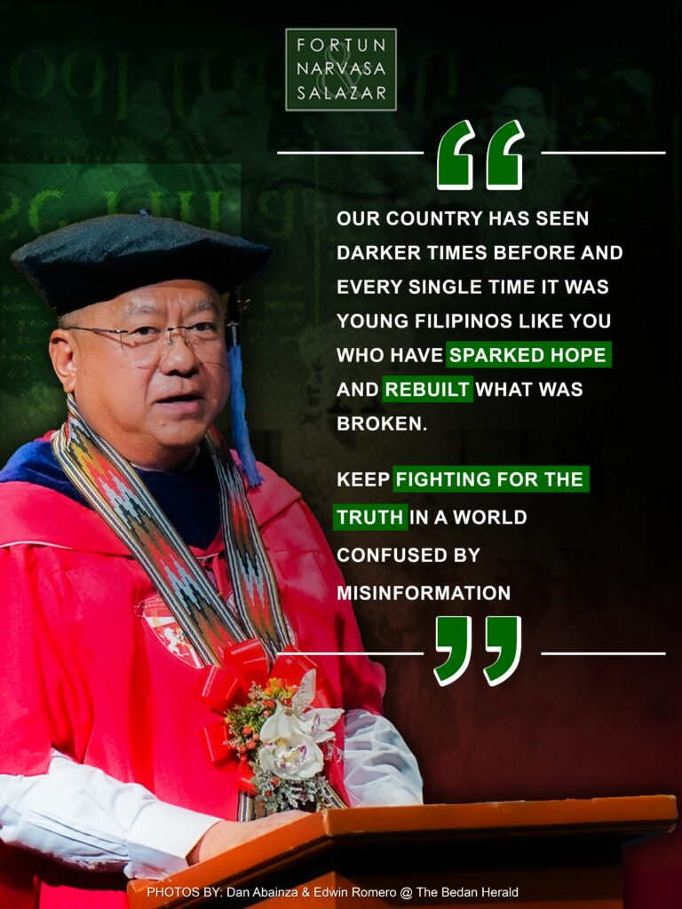 As you pursue your careers and perhaps, travel near or far — maybe abroad, maybe into new industries— dala n’yo ang mapa – your Mama at Papa or even a life’s map: your Bedan identity, your family’s dreams, your country’s hope – something that helps you navigate life.